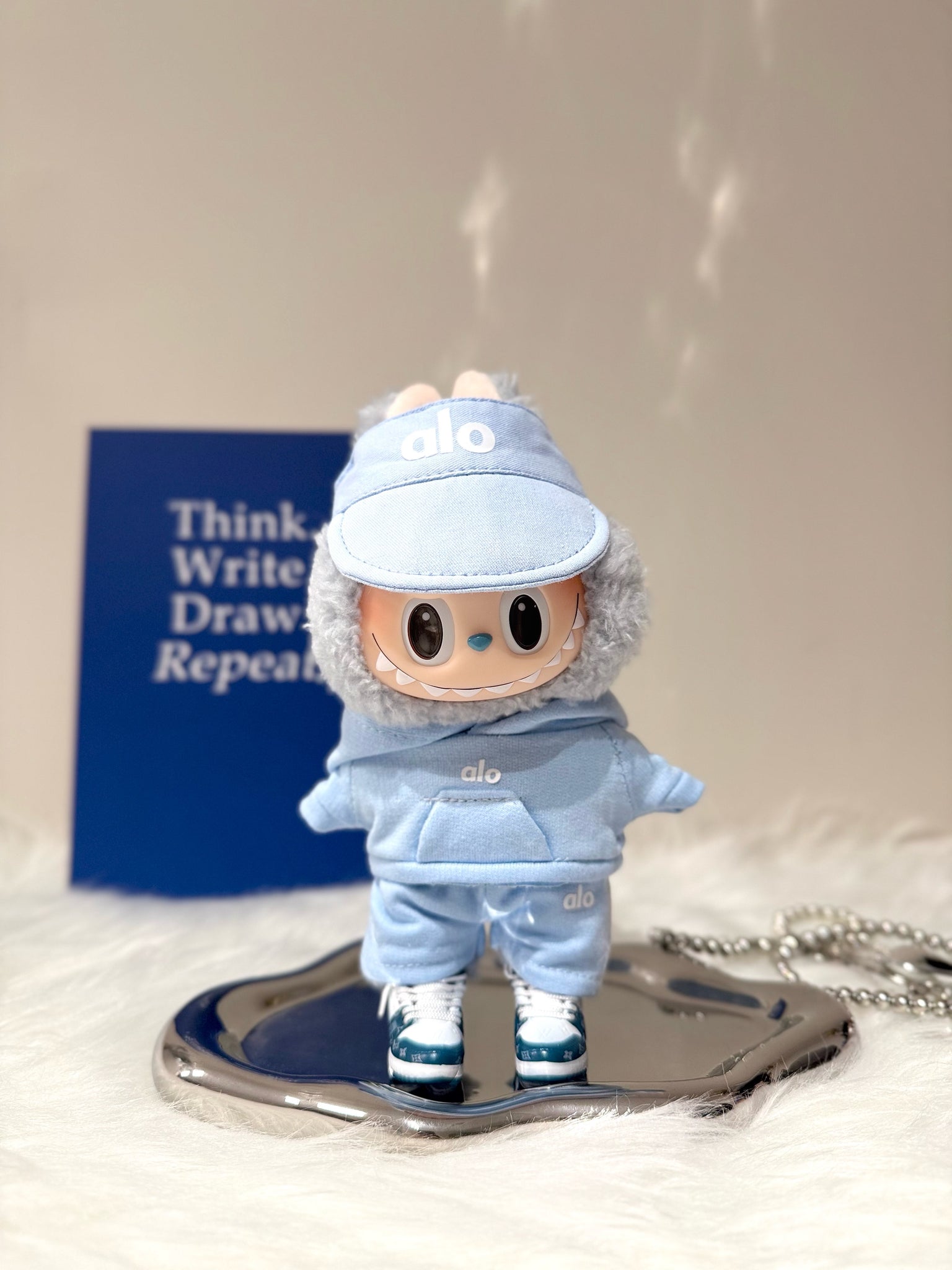 This blue sporty outfit makes Labubu look fresh and natural. The blue sports cap and shorts, paired with white sneakers, are an ideal choice for summer sports.