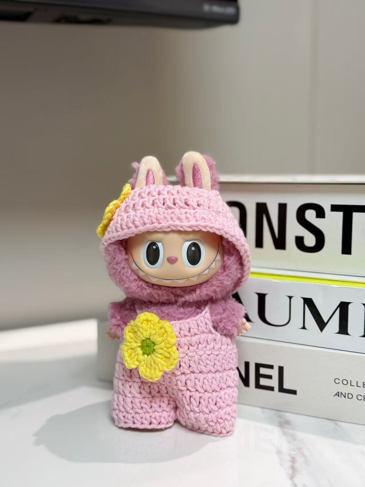 This pink hoodie makes Labubu look sweet and adorable. The yellow flower on the hood contrasts vividly with the pink, and the overall design is full of childlike charm.