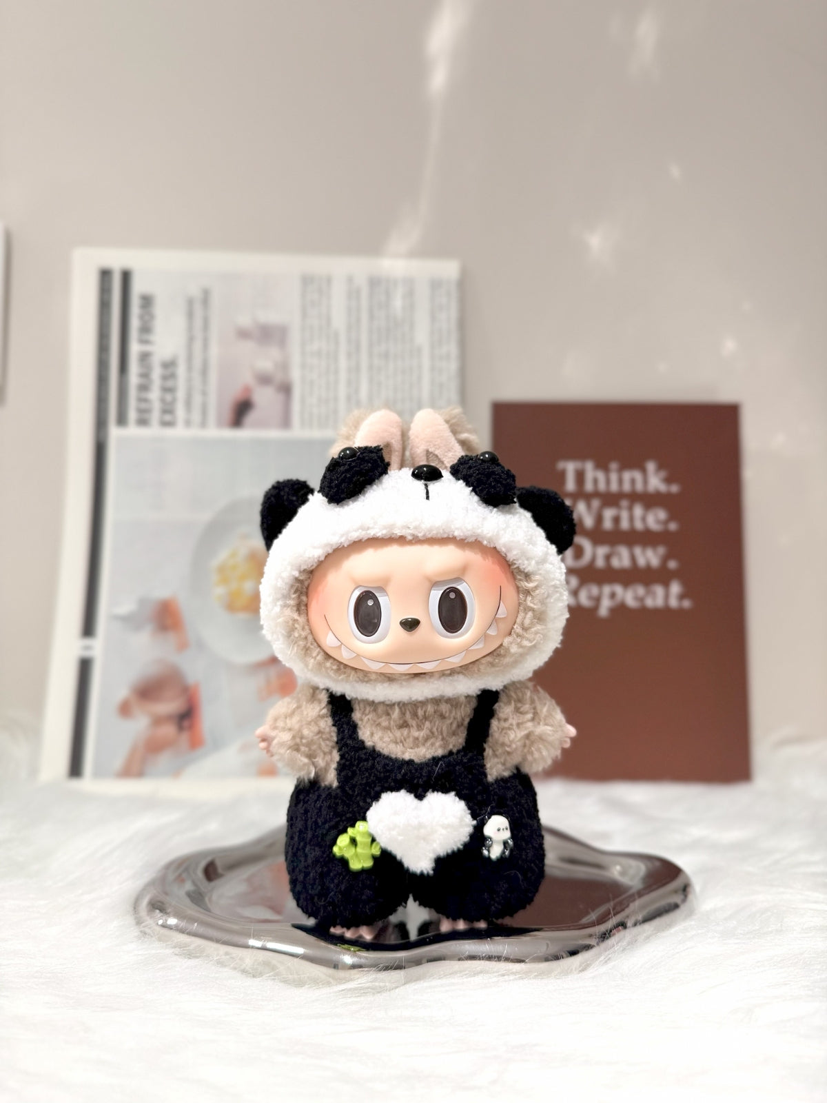This panda outfit makes Labubu look incredibly cute. The black and white coat, paired with panda ears and paws, is very appealing.