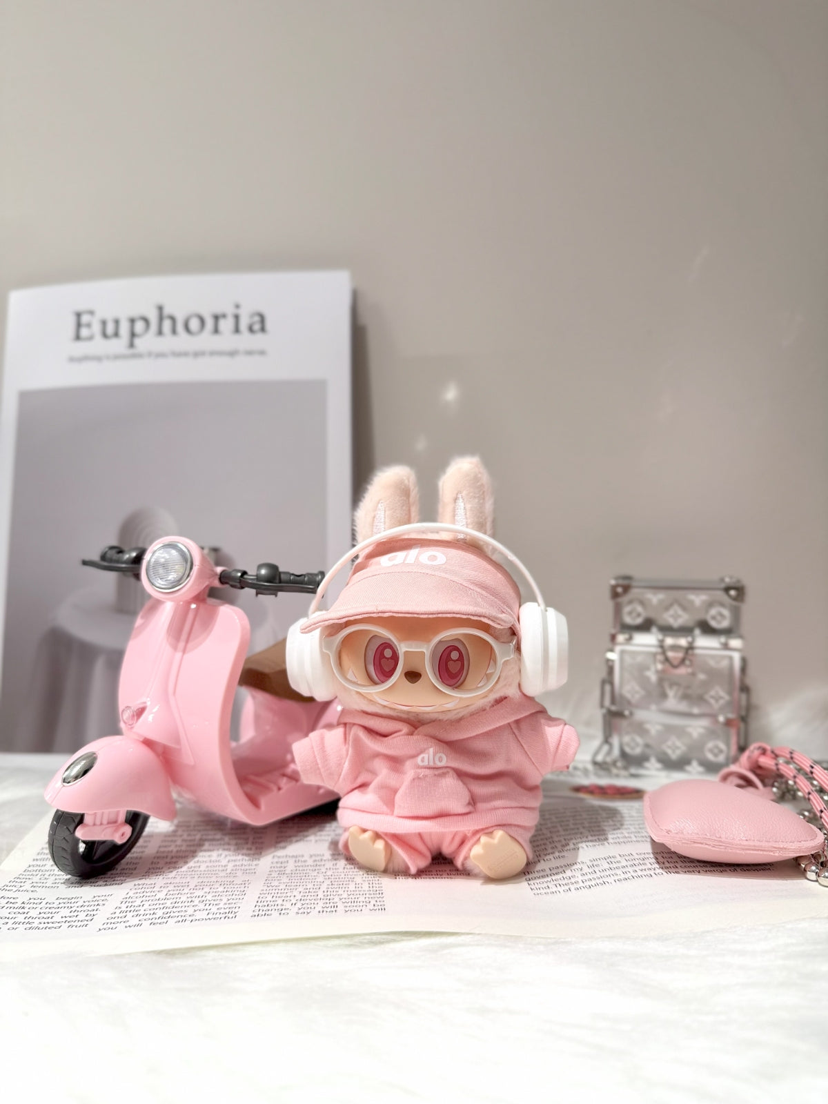This Labubu Alo pink sporty outfit includes a pink hoodie, headphones, and sneakers, showcasing a vibrant sporty vibe.